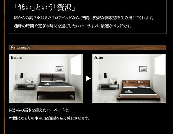 床からの高さを抑えたフロアベッドなら、空間に贅沢な開放感を生み出してくれます。趣味の時間や寛ぎの時間を過ごしたいローライフに最適なベッドです。
