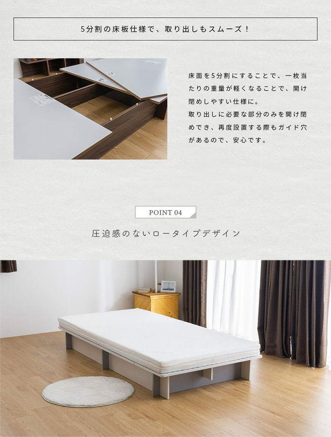 マットレス下は収納スペースにもなり、分割された床板を上げるだけで中身の取り出しが可能。設置や組立も簡単で、2台横並べてのご使用もおすすめです。