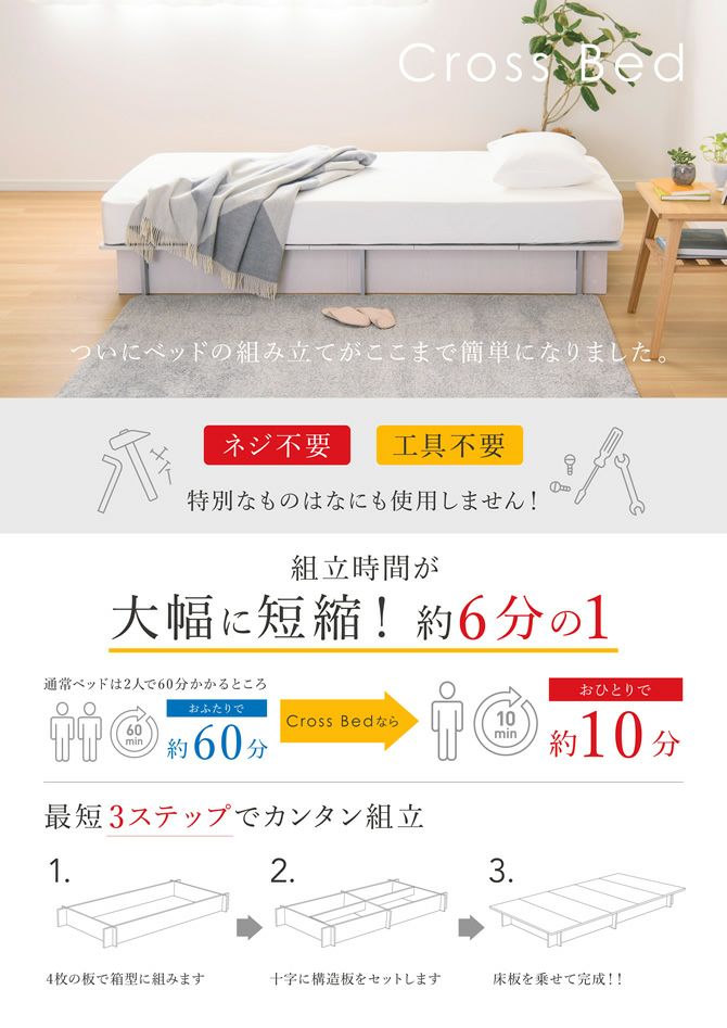 面倒な組立作業や工具の用意は不要の組み立て簡単ベッド!静止耐荷重は約400kg!フレームの床下は収納スペースとしても利用でき、追加オプションのシェルフはヘッドボードとしてもお使い頂けます。