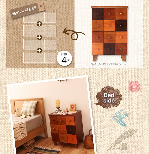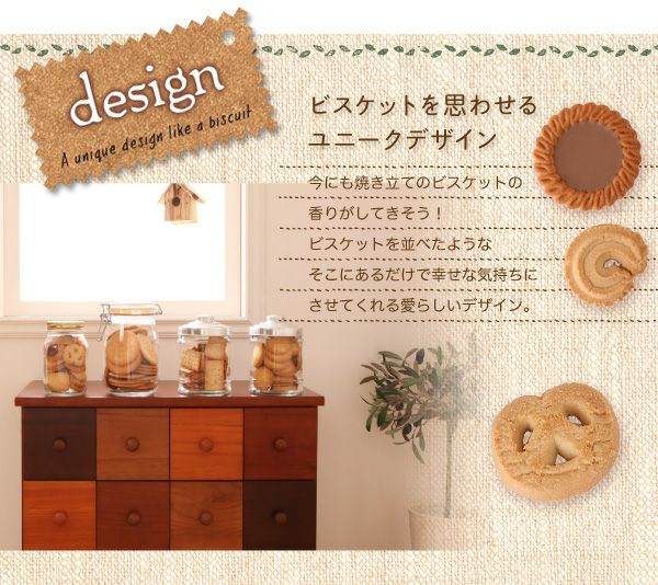 1つ1つが独立した引出しに見えて実はフェイクデザインのビスカシリーズ。まるでビスケットを並べてたようなユニークなデザインで、天然の桐材から木の質感やあたたかみを感じられるチェストです。