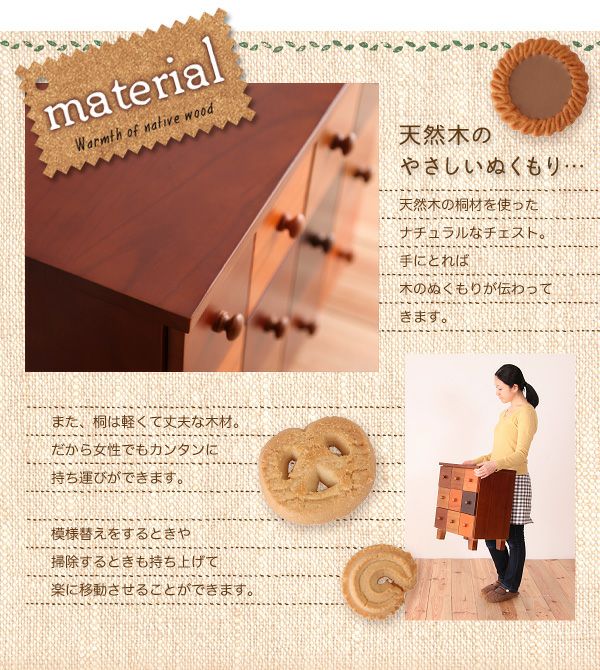 手にとれば木のぬくもりが伝わってくる天然木の桐材を使ったナチュラルなチェスト。また、完成品でのお届けなので、わずらわしい組み立て作業は無く、届いたらすぐにお使い頂けます。