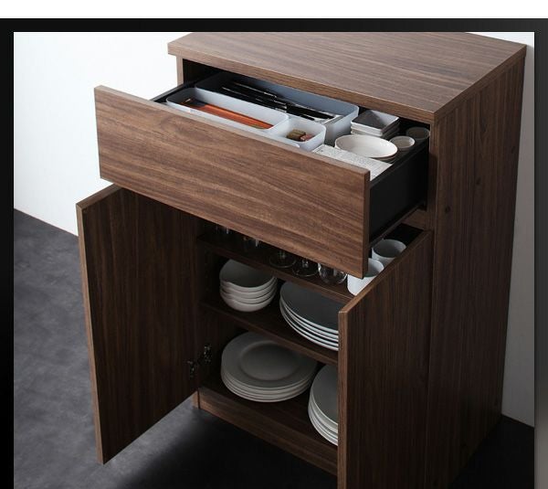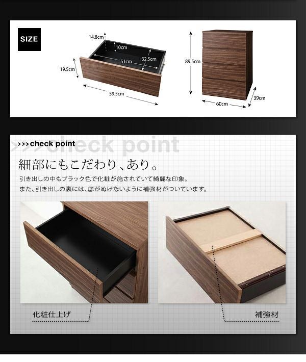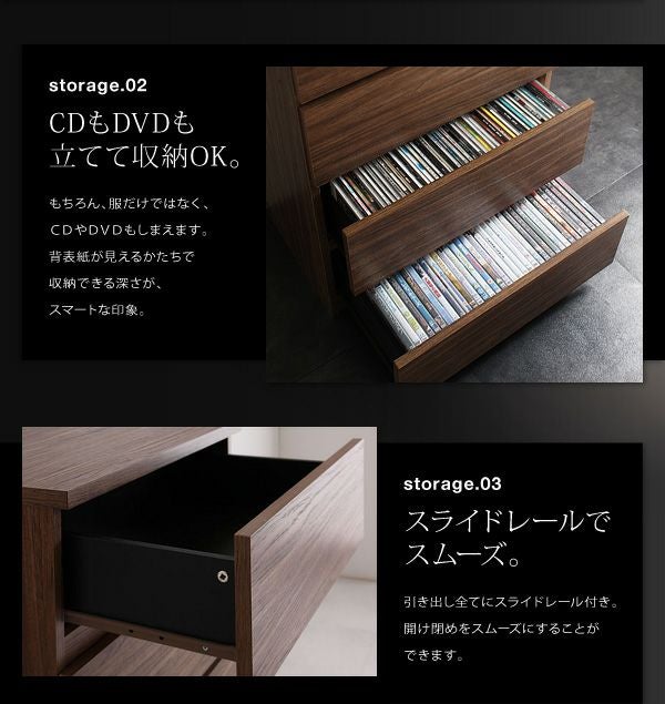 無駄を極限まで削ぎ落としたシンプルなフォルムで取っ手などもなく見た目にもすっきりとした印象です。本物の質感を醸し出す特殊な加工素材を使用したウォルナット調の木目からは温もりが伝わるデザイン。チェストやキャビネットなどと組み合わせも可能で、お得なセット販売もございます。