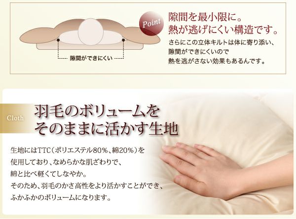 立体キルト:縫い合わせ部にも羽毛が入り込むので、熱が逃げにくい構造となっております。