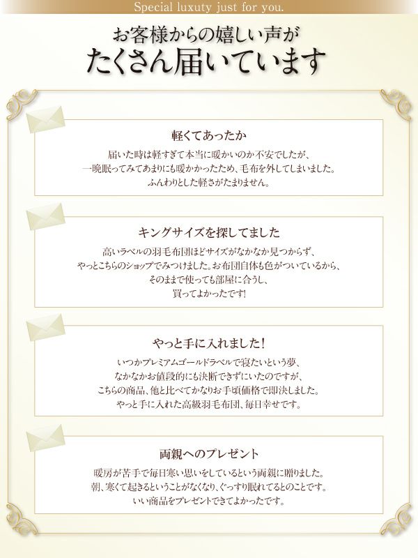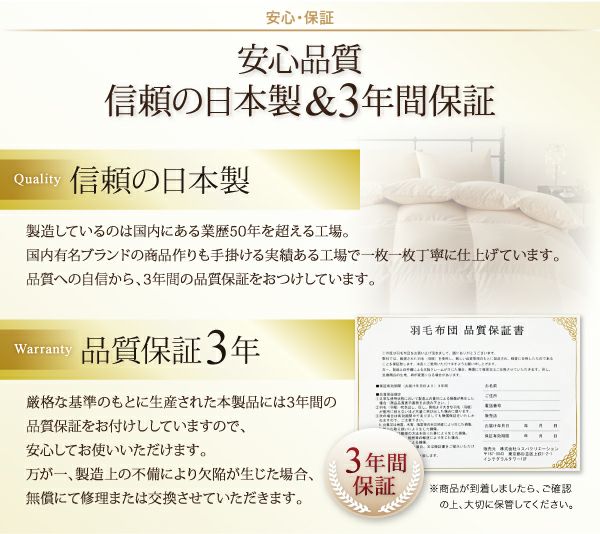 日本羽毛製品協同組合のかさ高証明ラベル『プレミアムゴールドラベル』を取得しています。