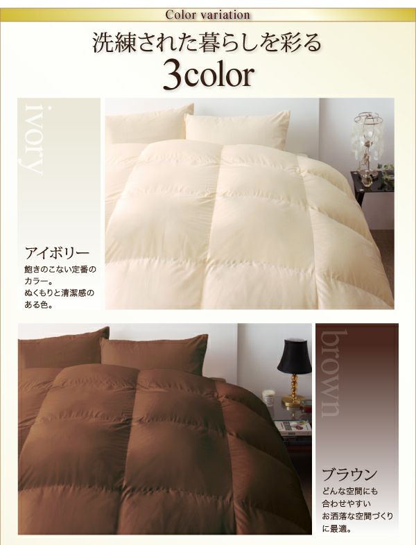 ポーランド産のマザーグースダウンを93%使用しており、ラベルの中で最高級であるプレミアムゴールドラベル。サイズはシングルからキングサイズまでの5サイズ。さらに3年間の品質保証が付いた安心の羽毛掛け布団です。