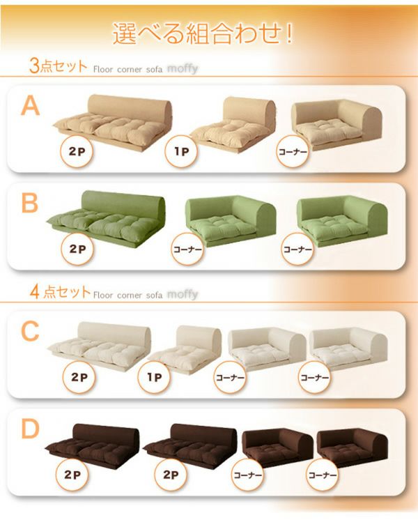 高さを抑えたフロアタイプのコーナーソファーは狭いお部屋でも、圧迫感を感じずにくつろげます。全4タイプの組み合わせと、スペースに合わせたパーツの組み換えで様々お部屋にフィット。座面のふかふかクッションは座り心地抜群でオールウレタンだから移動もらくらく♪
