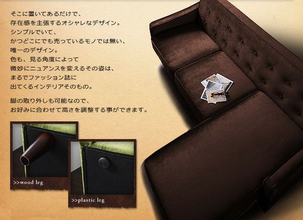 そこに置いてあるだけで、存在感を主張するオシャレなデザイン。高級感を演出するモケット生地は肌触りがよく光沢をもち、見る角度によって微妙に色が変化します。オットマンスタイルへ組み換えや脚部を外したロータイプでの使用も可能です。