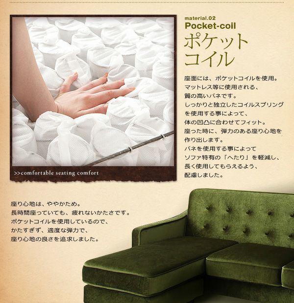 凛と佇む存在感。肌さわりの良いモケット生地とクッション性のあるポケットコイルを使用