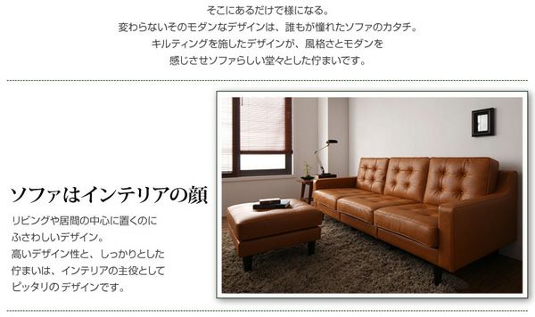 キルティングを施したデザインが、風格さとモダンを感じさせソファーらしい堂々とした佇まい。「本革のソファーが欲しいけど、価格の面や、汚れが心配…」そんなお悩みを決してくれるのも、まるで、本革のような表情を持ったヴァイキャスト加工PVCレザー(合皮)で、メンテナンス楽々です。