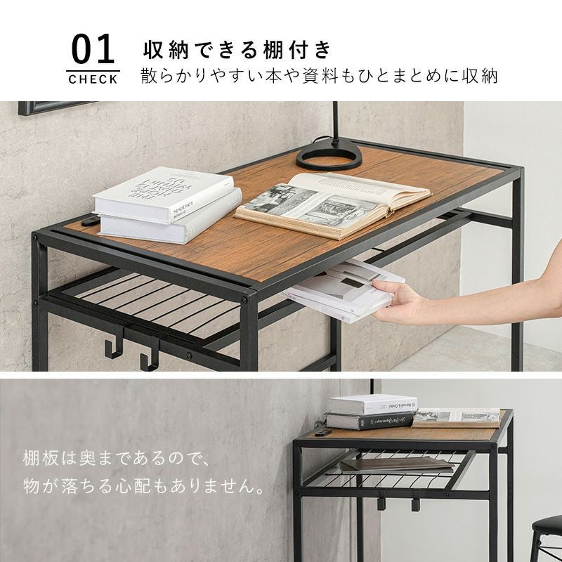 木目調の天板と、スチールフレームのデザインがおしゃれなデスクチェアセット。便利な中棚とコンセント付。