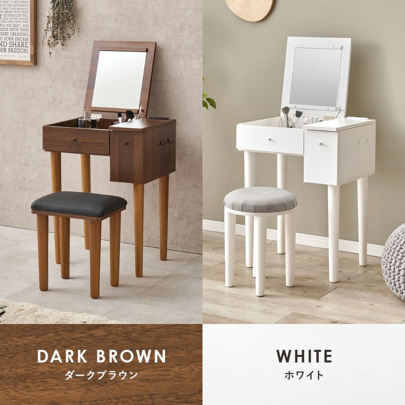 メイクで使わない時はパソコンを置いてちょっとしたデスクワークにも便利な2WAYタイプのドレッサー。ミラーの角度調整も可能で、コンセント・フック・引き出し収納と使い勝手を考えた嬉しいポイントが盛りだくさんです!