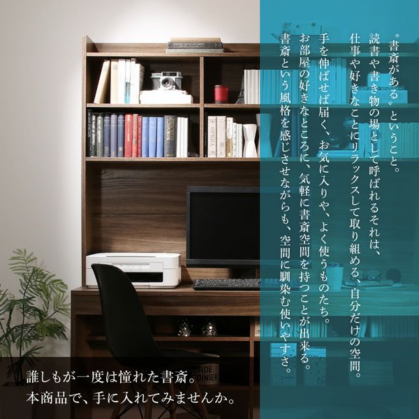 読書や書き物、仕事や好きなことにリラックスして取り組める自分だけの空間。背の高いモニターやプリンター・周辺機器もまとめておけて作業効率アップ。足元にも収納棚があるので使用頻度の低い書類などを置けばまとめて一気にデスクが片付きます!