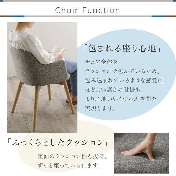 すべての角を削ったチェア全体の“まるみ”と、ふっくらとしたクッションに包み込まれるデザインチェア。かわいらしいだけでなく、上品さもあるそのデザインは、リビングや玄関など置くだけでインテリアとして成立するチェアに。