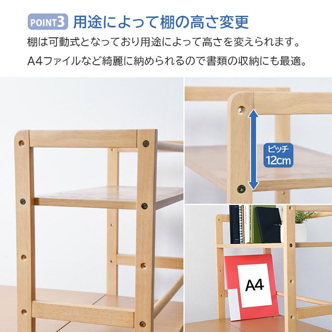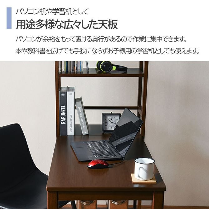 散らかりがちなデスク周りの整理に最適なラック付き!書類や本などをすぐに取り出せて便利です。ラックは左右入替可能&棚は可動式なのでお好み合わせて変更できます。