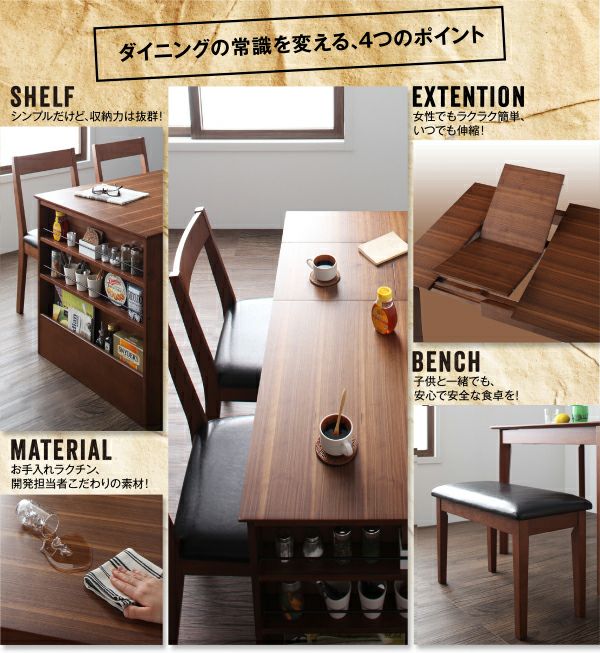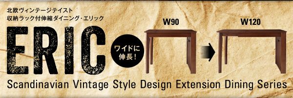 収納ラック付 伸縮ダイニング 北欧ヴィンテージテイスト 【Eric】エリック 4点セット