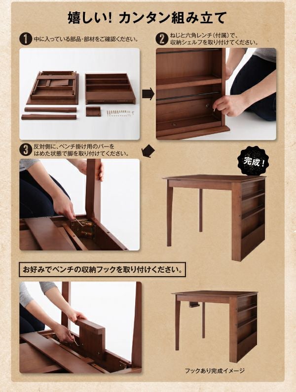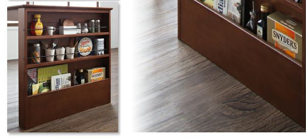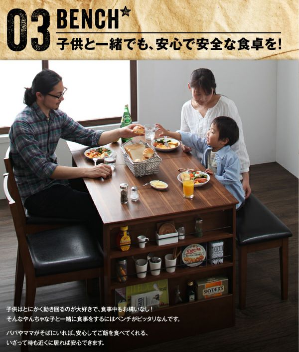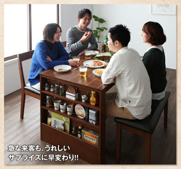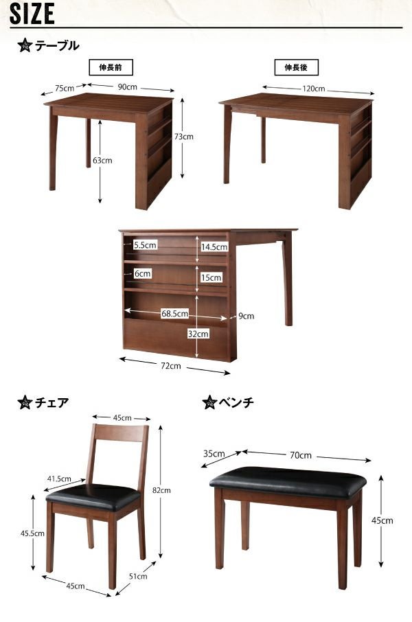散らかりがちなテーブル周りの調味料や小物類、読みかけの雑誌などこれらをスッキリと片付けてくれるシェルフラック付のダイニングです。テーブルは伸長式でW90cm・W120cmの2サイズで使用可能。来客時にも重宝する機能です。
