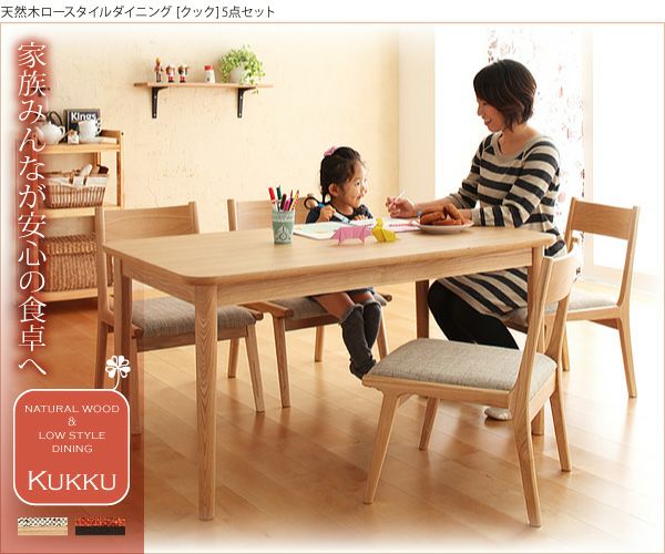 テーブルの高さが64cmのロースタイルのダイニングセット。狭いお部屋にも圧迫感なく置けて、丸みのある優しいデザインは様々なインテリアに馴染みます。木目はウレタン塗装仕上げで、水や汚れに強いのも嬉しいポイントのダイニング5点セットです。