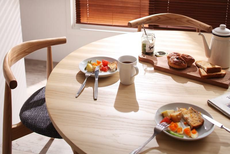 デザイン性の高い脚部と天板の丸みをミックスさせたラウンドテーブル。四角いテーブルに比べてどこに座っても距離感が近く感じられる丸いテーブルなら家族の距離が縮まり会話が広がります。ウェグナーデザインの名作チェアーは選べる2種類をご用意。