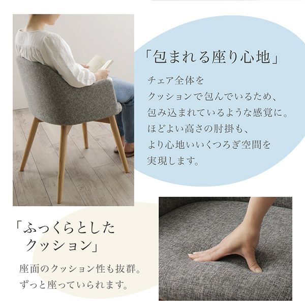 チェアはチェア全体をクッションで包んでいるため、包み込まれているような感覚に。ほどよい高さの肘掛も、より心地いいくつろぎ空間を実現します。