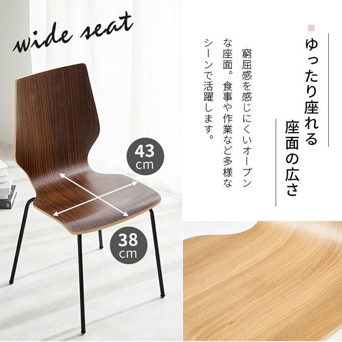 背面も木目調なのでコーディネートがしやすく、ゆったり座面で窮屈感を感じにくく、使わない時はスタッキング(積み重ね)も可能です。