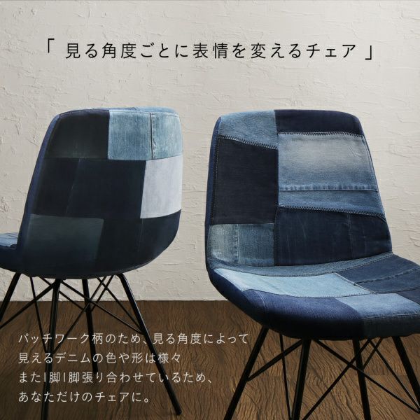 さまざまなデニムを組み合わせたパッチワーク柄のため、見る角度によって見えるデニムの色や形は様々。また1脚1脚張り合わせているため、あなただけのチェアになります。