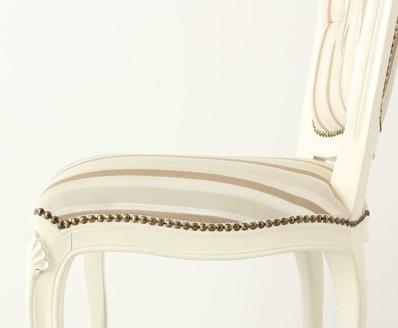 思わず目を奪われる、繊細かつ優雅な装飾。アンティークゴールドの鋲打ちがクラシカルな印象を醸し出し、背もたれのボタン留めが格式の高さを演出します。