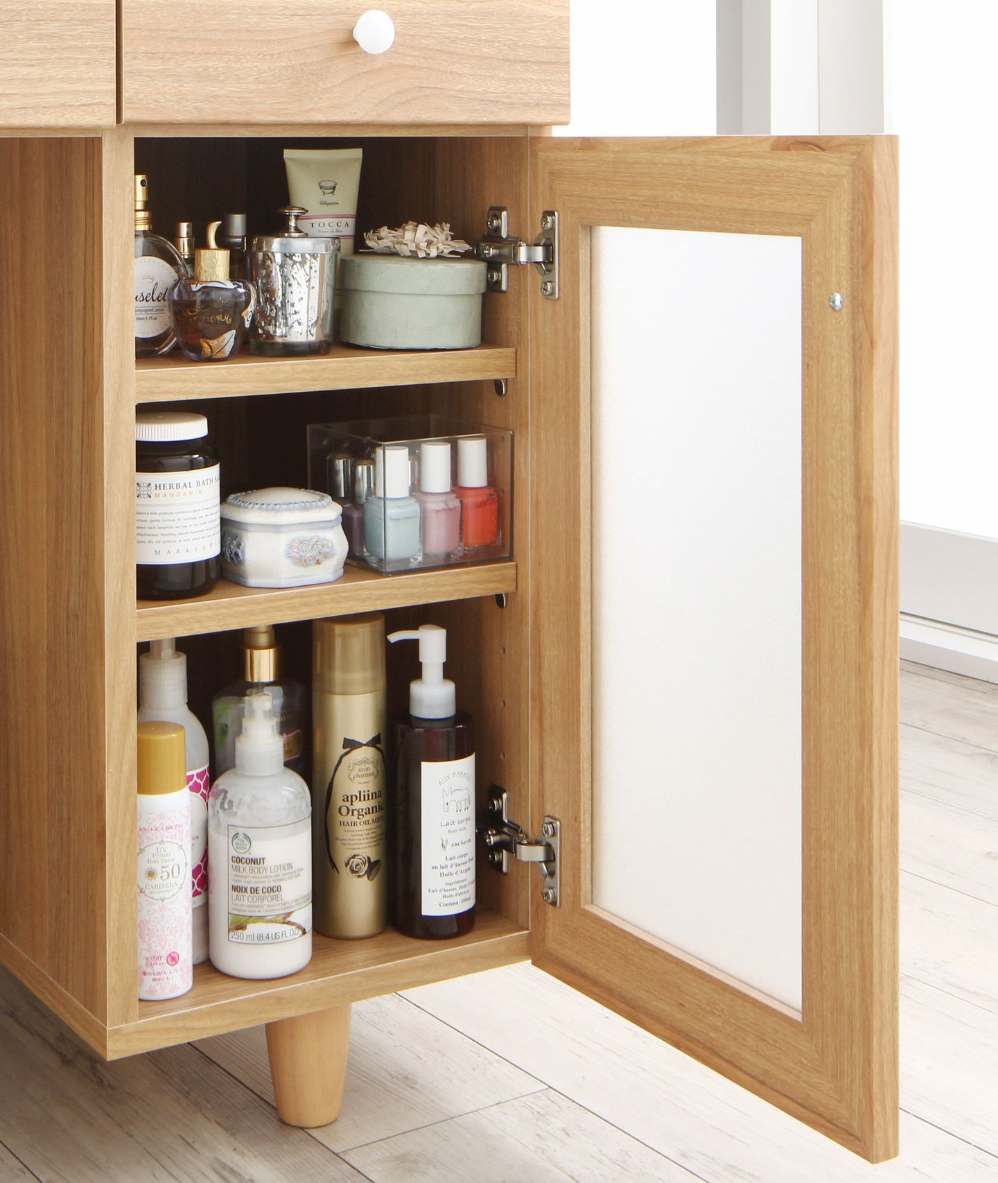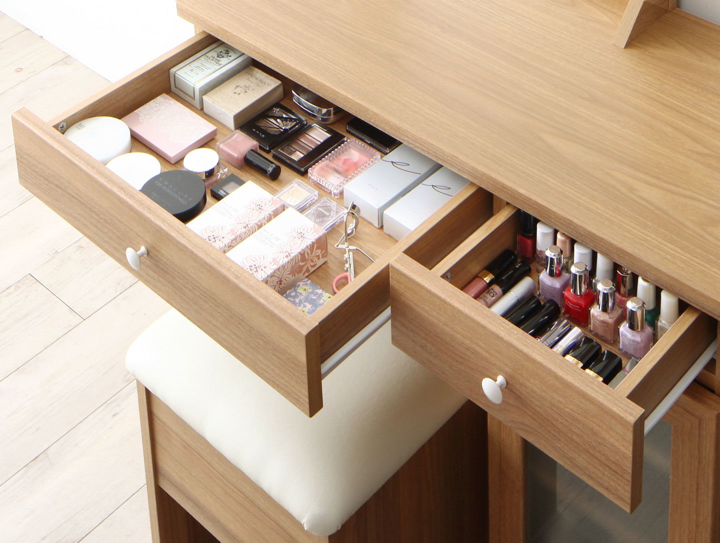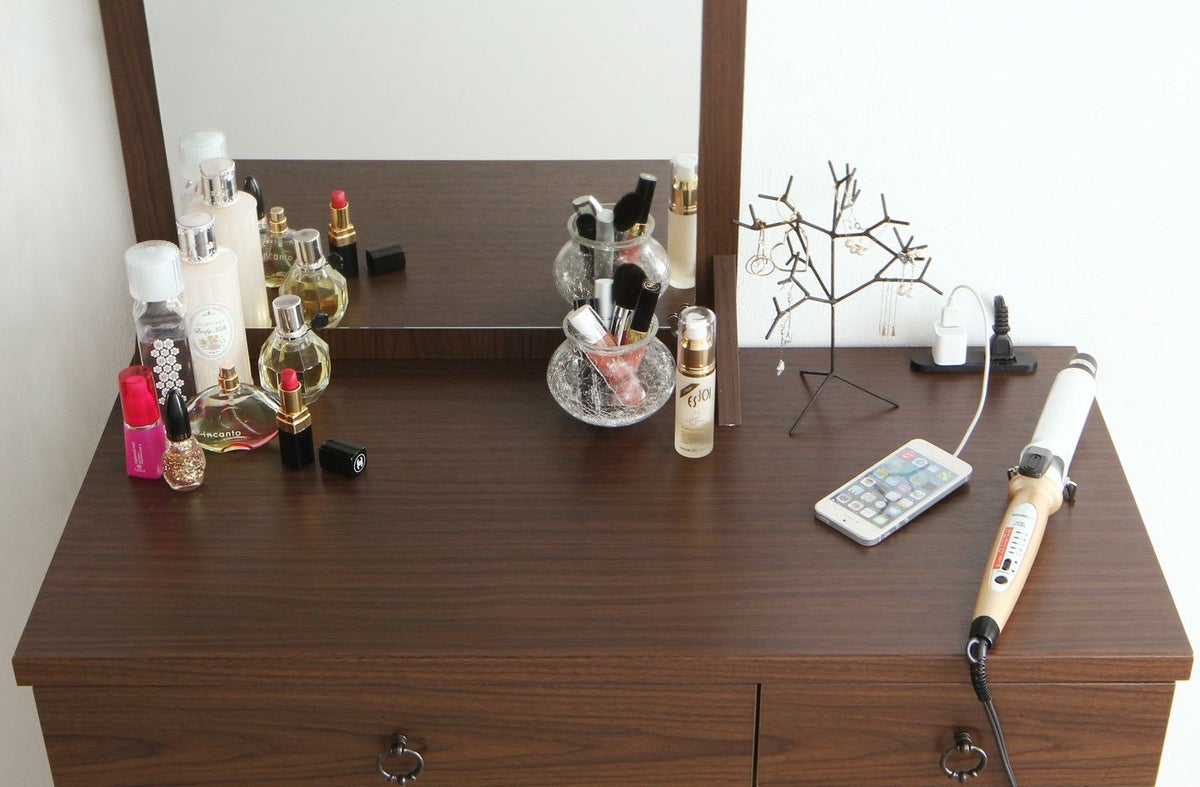 ヘアアイロンやドライヤーも置ける広々スペースで1日の美容タイムを快適で優雅に。毎日使うメイク道具やストックは大きな引き出しに。マニキュアやスティック状の細かいメイク道具は小さい引き出しに。2口コンセント付きなので、スマホを充電もしながら朝の支度ができます。