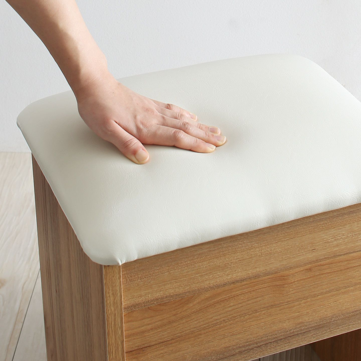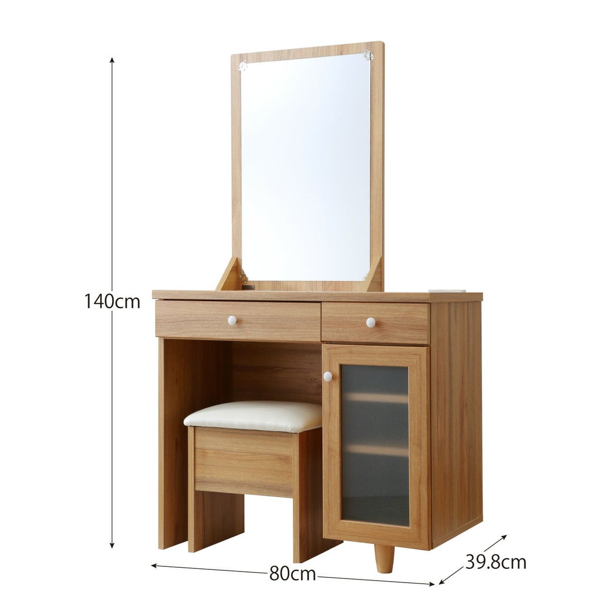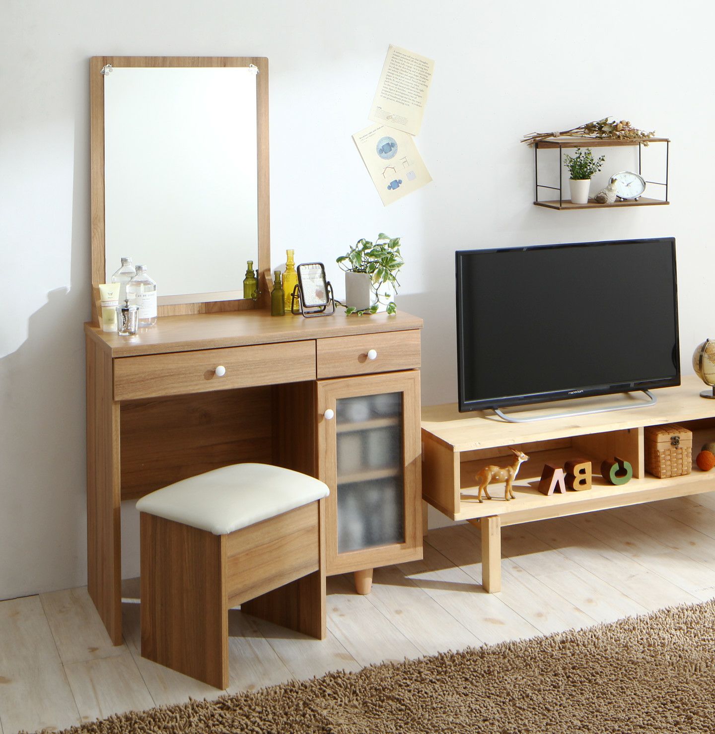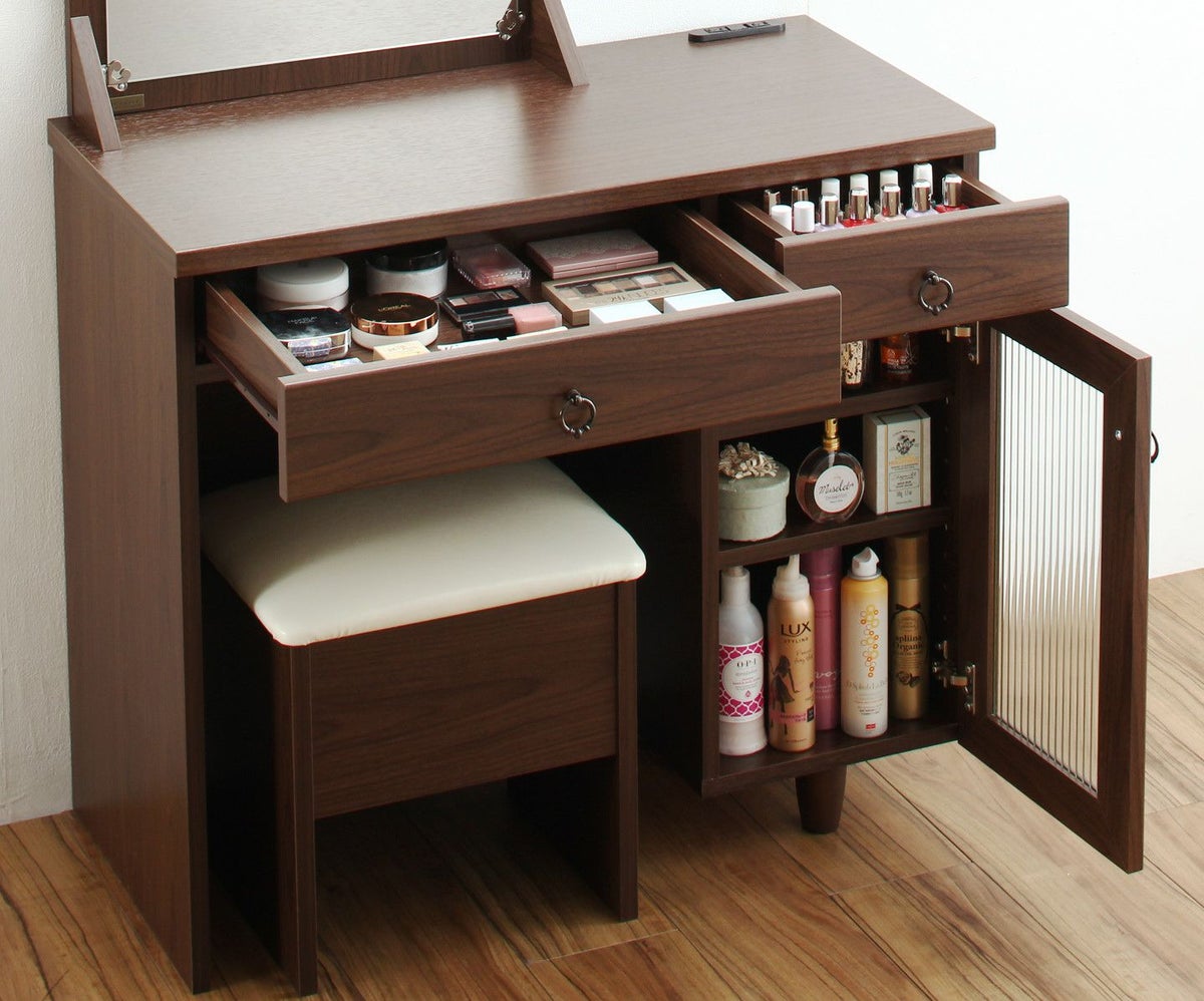 忙しい朝に嬉しい広々スペース!2口コンセント、スツール付きの化粧台。上半身までばっちり映る大きな鏡は、顔全が見えるのでメイクがもっと綺麗に仕上がります。引き出しや可動棚の収納付きで大きさに合わせてメイク道具の収納が可能です。
