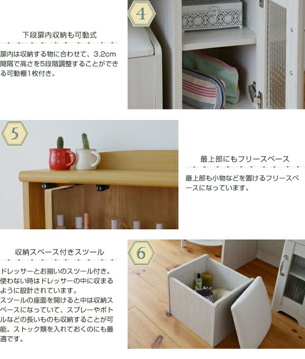 ドレッサーには欠かせない三面鏡の中には、高さ調整が可能な可動棚でたっぷりとコスメグッズを収納できます。スツールの中にももちろん収納スペースを完備しており、スプレーやボトルなど高さのあるものや、たまにしか使わないもののストックにも便利。