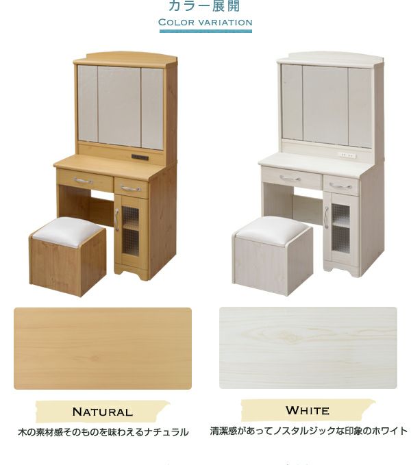 スタンダードなカラーでシンプルな三面鏡ドレッサー。お得なセットのスツールは座面の中に収納可能なスペース付。広めの引出しと小さめの引出し、背の高いものも収納できるガラス扉収納スペースもあり、ミラーの裏側にも収納できるので、メイクアップに必要なものを大量収納できます。2口コンセント付きなので、ドライヤーやヘアアイロンもドレッサー周りでご使用いただけます。