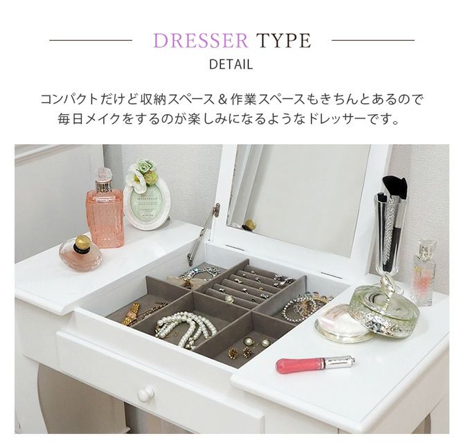 天板の開閉だけでドレッサー・デスクの両方使いが可能!指輪やネックレスなどアクセサリー収納スペースと、メイク道具の小物を入れる引出し収納付き。