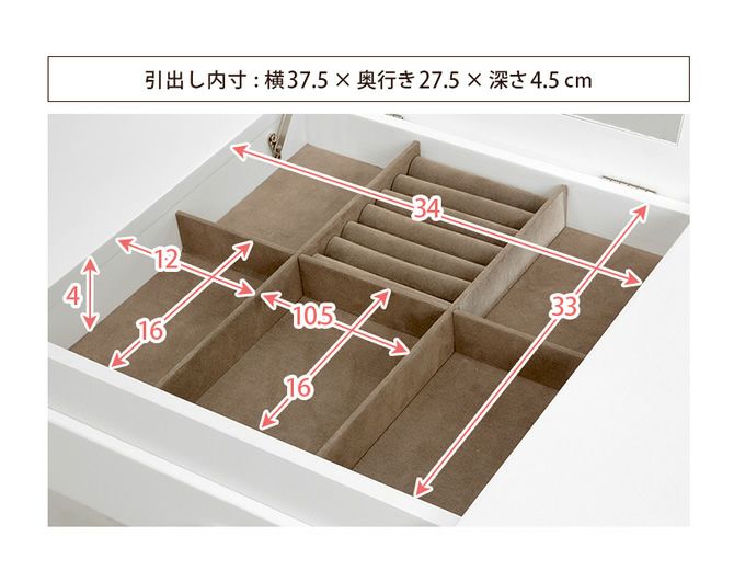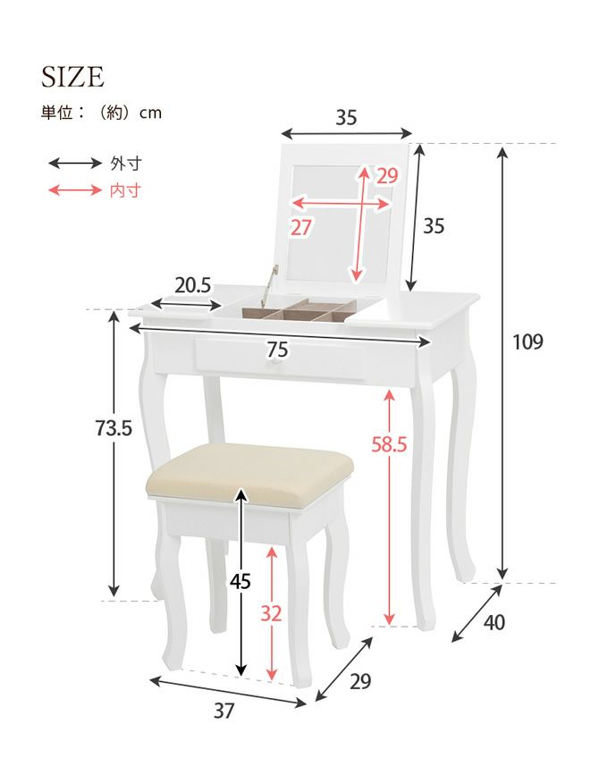 【サイズ】 ドレッサー:(約)幅75×奥行40×高さ73.5cm(※天板オープン時高さ109cm)