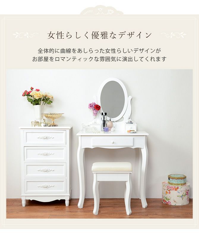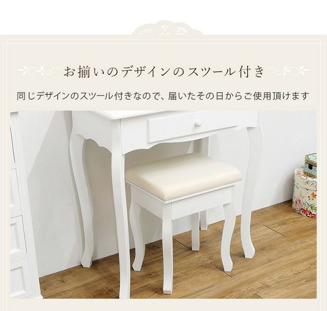 全体的に曲線をあしらった女性的なデザインがお部屋をロマンティックな雰囲気に。コンパクトながらきちんと確保された作業スペースで毎日のメイクをより楽しいものに。スツール付きのセットです。