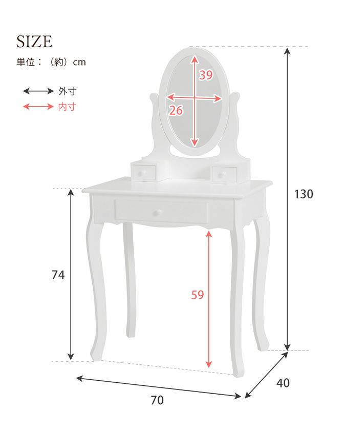 【サイズ】 ドレッサー:(約)幅70×奥行40×高さ130cm(※天板までの高さ74cm)