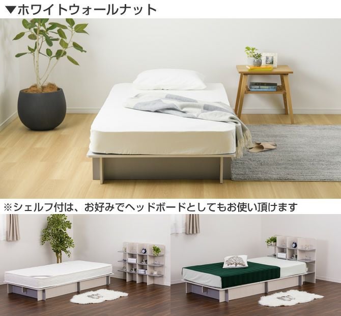 オプションのシェルフを付属頂くと、ベッドルーム付近の収納としてや、頭側に寄せるだけでヘッドボードとしてもお使い頂けます。(シェルフとベッド本体は連結できません)