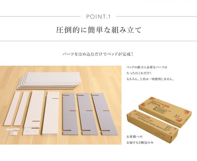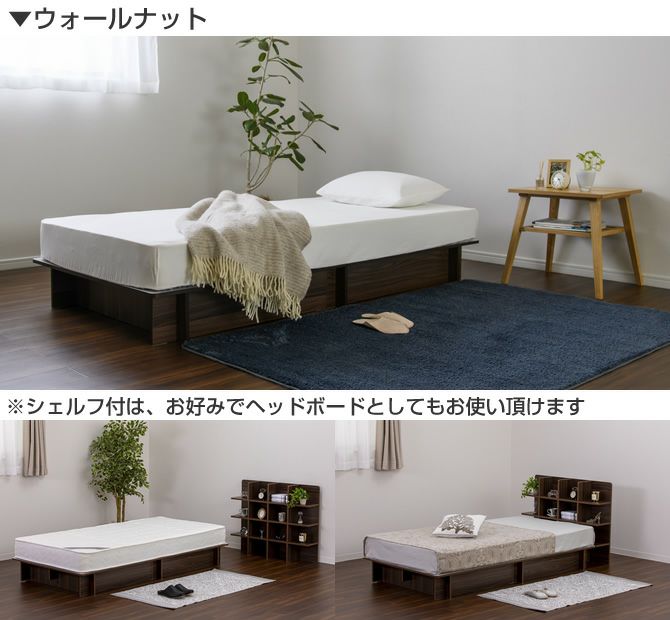 面倒な組立作業や工具の用意は不要の組み立て簡単ベッド!静止耐荷重は約400kg!フレームの床下は収納スペースとしても利用でき、追加オプションのシェルフはヘッドボードとしてもお使い頂けます。