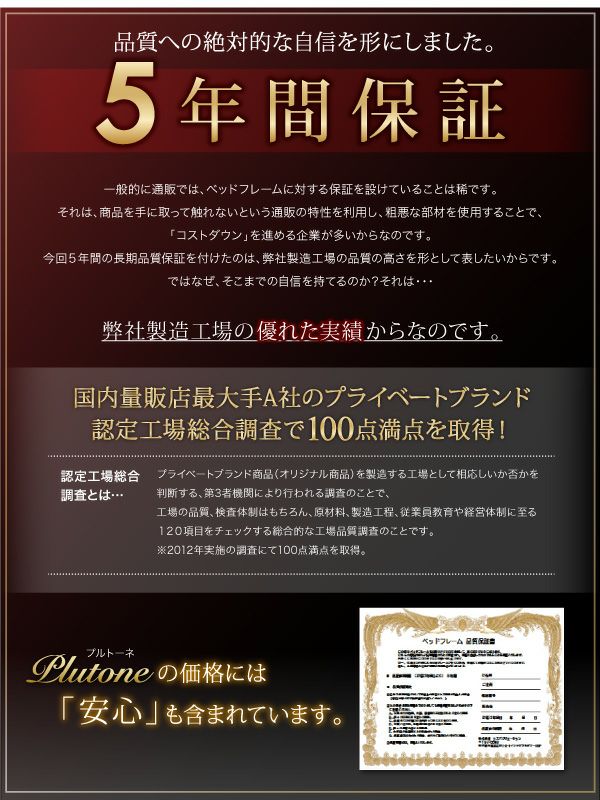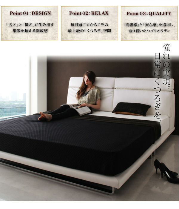 開放感ある空間を手に入れ、かつ優雅さを手に入れるにはローデザインベッドがおススメです。さらにソファのように背もたれになるヘッドボードは8段階のリクライニング機能付。フレームは安心の5年保証です。