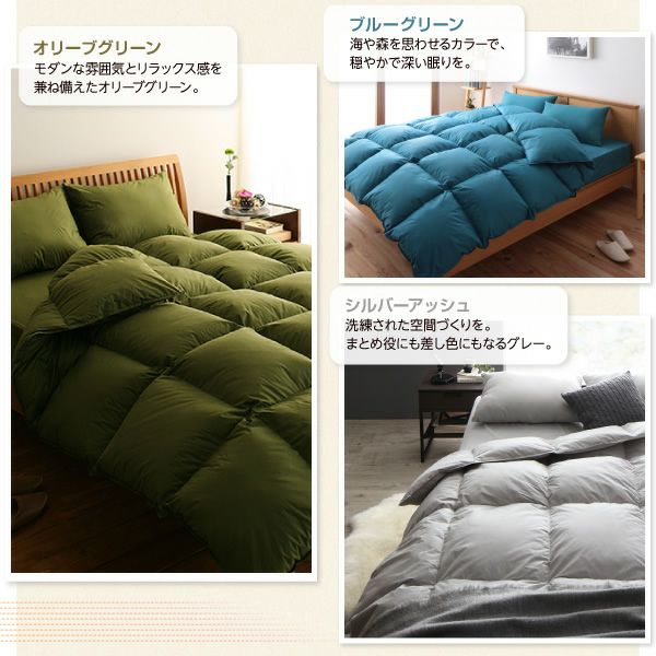 オールシーズン使えるセット内容に、豊富なカラー・選べるサイズに加えて、3年間の品質保証まで付いて何拍子も揃った羽根布団セット。