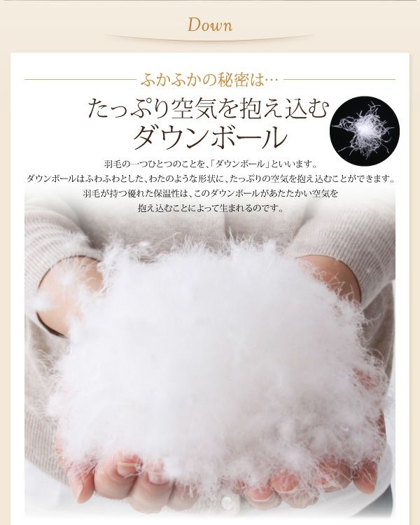 ふっくらとしたボリュームがありながらも非常に軽い。暖かい空気に包まれているような寝心地は、羽毛ならではの魅力といえます。また、お肌に直接触れる側地には、ソフトな肌ざわりの綿100%の生地を使用。天然の繊維だから、羽毛が持つ吸放湿性を損ないません。