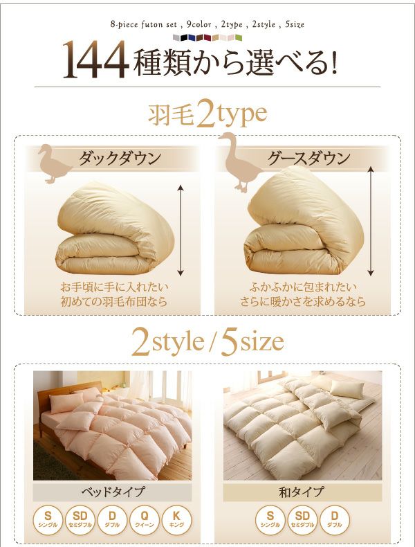 9色から選べる!羽毛布団8点セット