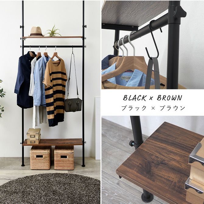 天井への突っ張りタイプなのでお部屋の好きな場所に設置して小物類や衣類をスッキリきれいに収納。2枚の棚とハンガーラックの高さは身長や収納物に合わせて高さ調節が可能です。