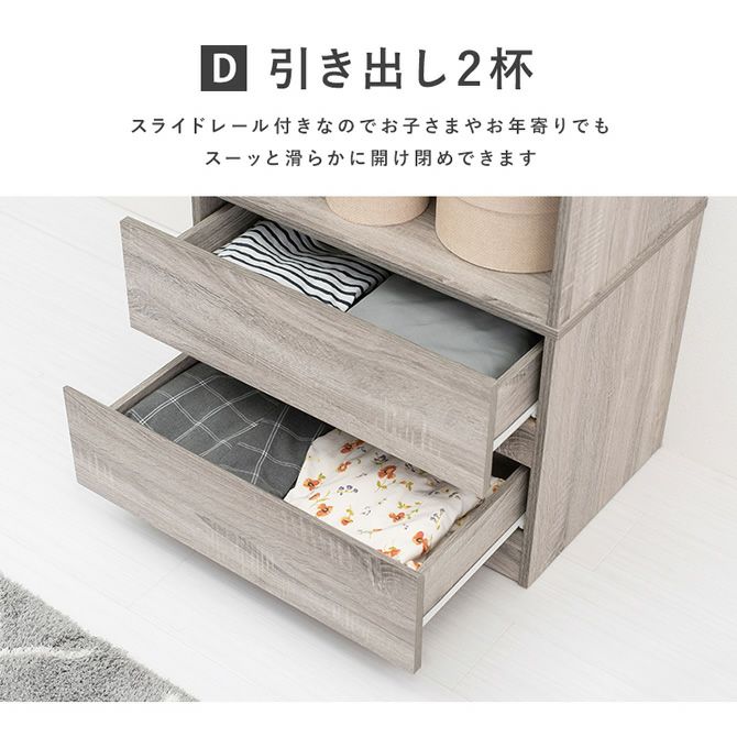 引出しはスライドレール付なので出し入れもスムーズ。家族みんなのクローゼットとしてもおすすめのワードローブです。