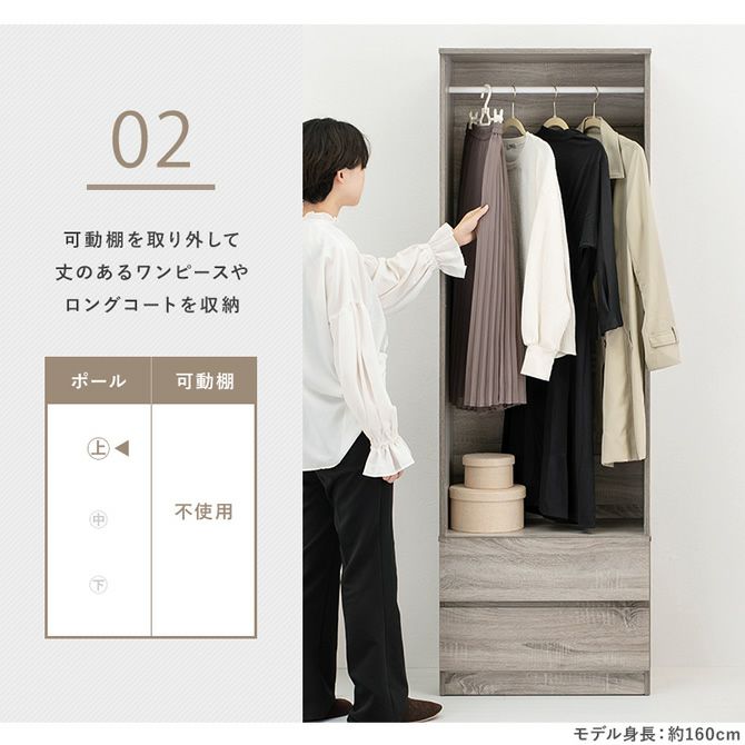 ハンガーポールや可動棚の位置は使い勝手に合わせて調節が可能!お子様でも手の届きやすい位置に調節したり、お好みで変更頂けます。