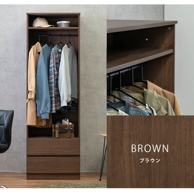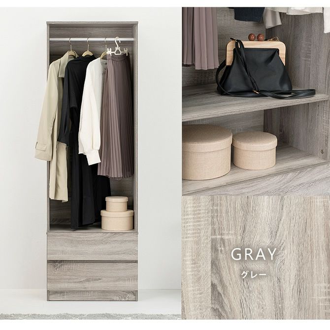 ハンガーラックと引出し収納がこれ1台で完結!サッと取り出せるようにハンガーポール部分はオープンになっているので忙しい朝の身支度もスムーズに。下段の隠せる引出し収納が2杯付!