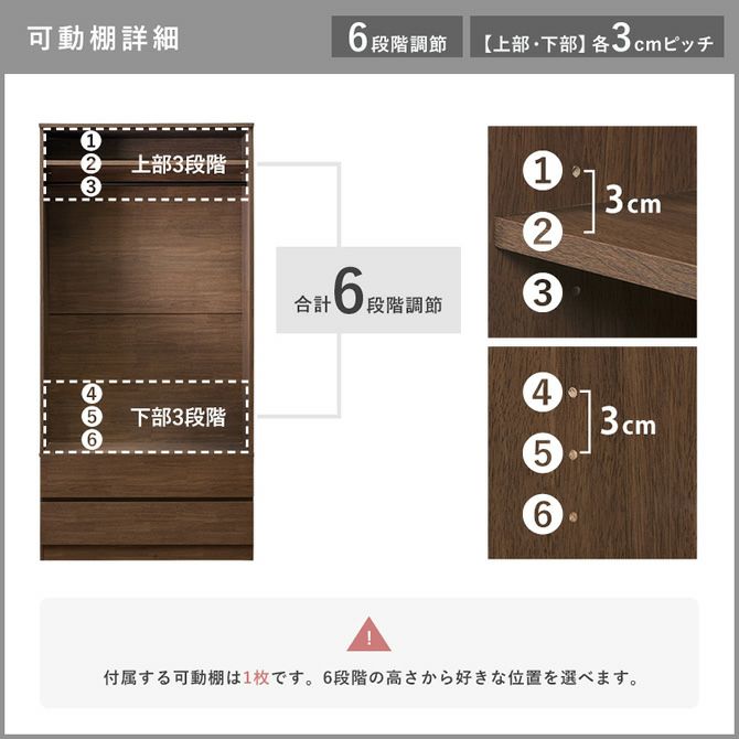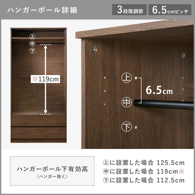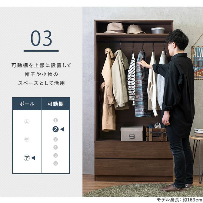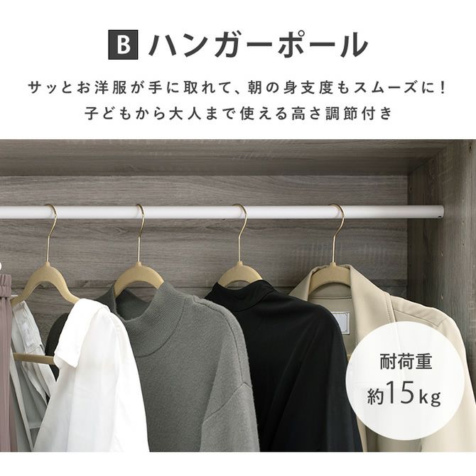 ハンガーポールや可動棚の位置は使い勝手に合わせて調節が可能!お子様でも手の届きやすい位置に調節したり、お好みで変更頂けます。