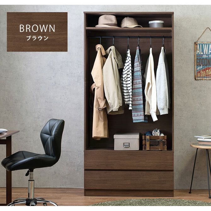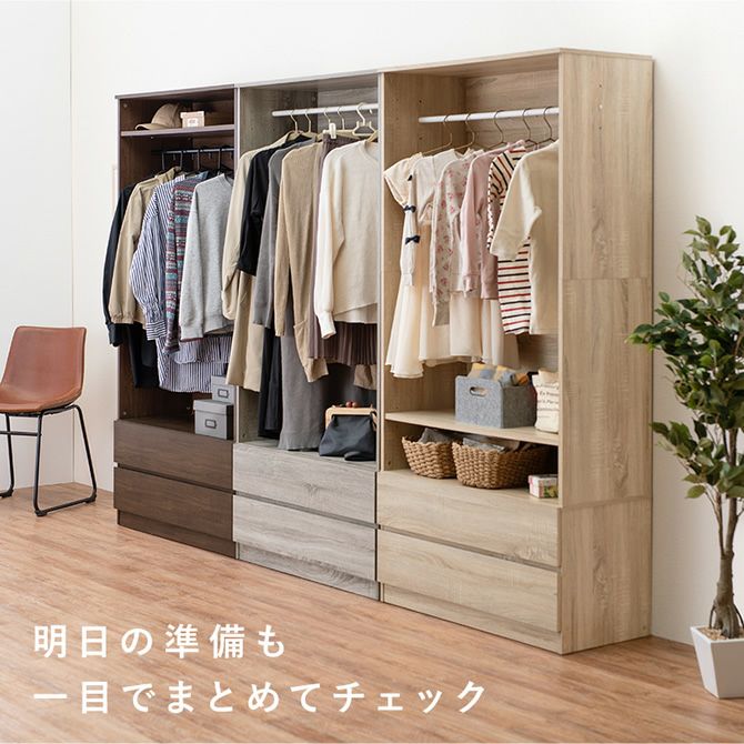 ハンガーラックと引出し収納がこれ1台で完結!サッと取り出せるようにハンガーポール部分はオープンになっているので忙しい朝の身支度もスムーズに。下段の隠せる引出し収納が2杯付!