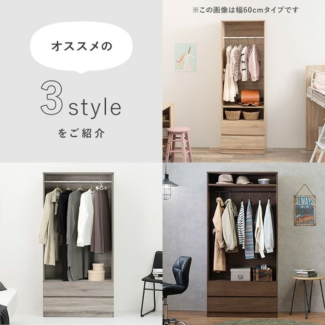ハンガーラックと引出し収納がこれ1台で完結!サッと取り出せるようにハンガーポール部分はオープンになっているので忙しい朝の身支度もスムーズに。下段の隠せる引出し収納が2杯付!