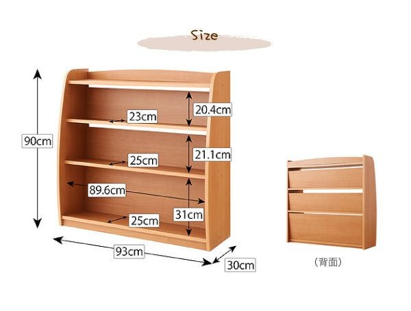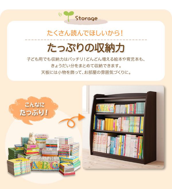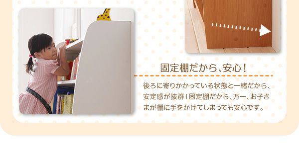 棚面が斜めだから、本のタイトルも見やすく、本が落ちにくいのもポイント!重心が後ろで倒れにくく安定感が抜群!固定棚だから、万一、お子さまが棚に手をかけてしまっても安心です