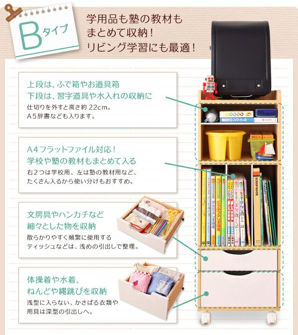 丸みのあるデザインで安心・安全に設計されたキッズ収納。絵本やおもちゃ、ランドセルの収納に最適で、大きくなってもお使い頂ける工夫が施されています。