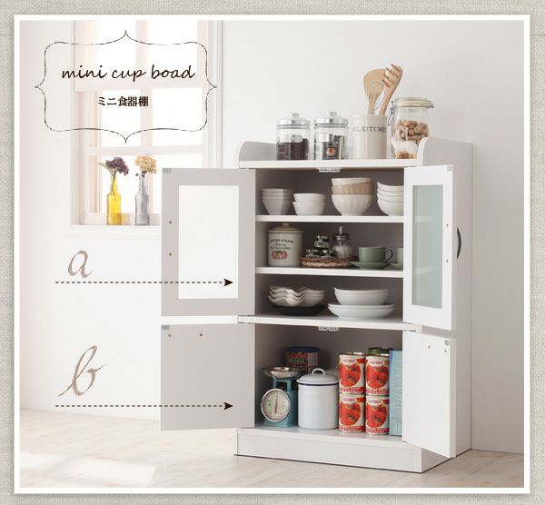 お部屋に圧迫感を与えずに食器などの取り出しも楽々な高さのコンパクトなキッチン収納シリーズ。パステルグリーンorホワイトの2色のカラー展開で組立不要の嬉しい完成品!アンティーク風の取っ手と角の丸みが女の子らしい雰囲気に仕上げました♪